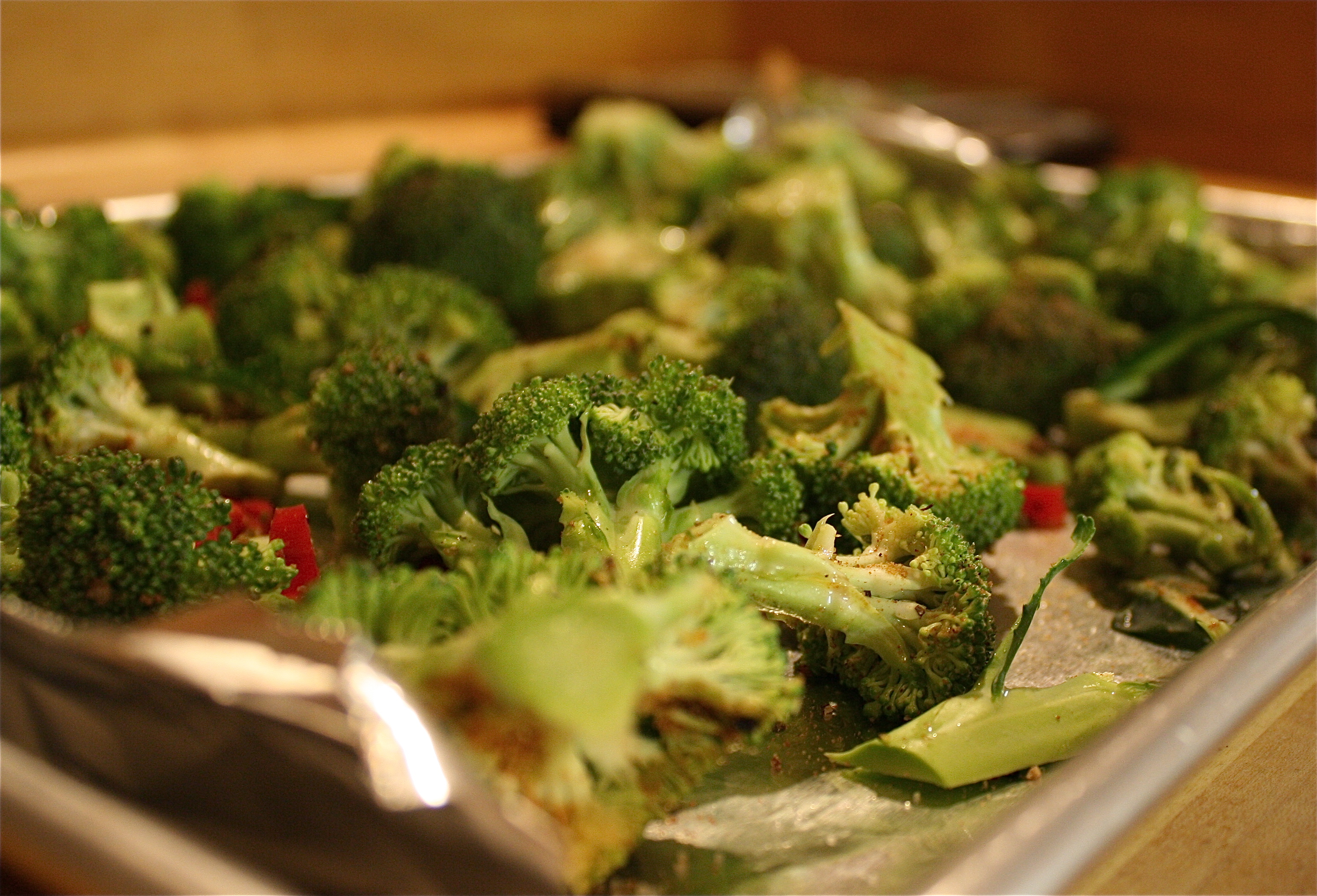 - Mix broccoli, seasonings, and oil and spread out on baking sheet.