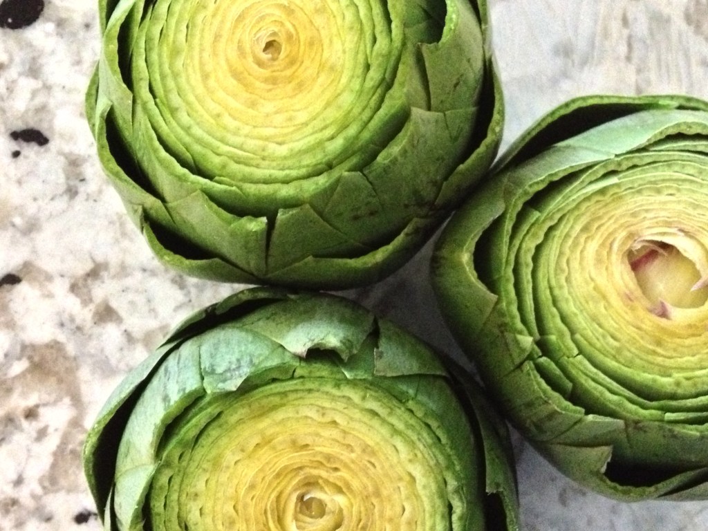Before you go ahead thinking, “Wait, Christmas cookies?!?! Already? I thought I was ahead of the game because I started listening to Christmas songs to pass the time at work on Wednesday! But cookies?” I can explain; for many years, my aunt has been making a variety of Christmas cookies to distribute on Christmas Eve to family and friends. She distributes them in crisp white oblong boxes, which when opened reveal bite sized cheesecakes, pound cakes, snicker doodles, macaroons, ladyfingers, and the culprits yesterday- a rich chocolate brownie, cupped by a thin layer of sweet dough. They are at the center of the pie-cookie-brownie intersection, which sounds like a very good place to be, and have come to be known as fudge delices. Delice means “delight” in French, although we pronounce it del-a-say. At the height of her baking, she would make 200 dozen of each cookie in the weeks between Thanksgiving and Christmas, and then distribute them on Christmas Eve. Around ten years ago, she called in my cousins and me for help with the labor intensive fudge delices, and tradition was born. While the sheer number of cookies has been greatly reduced in size these past few years, we still gather the day after Thanksgiving around her kitchen table to make and form dough, stir pots of chocolate, and tell the same jokes. Fudge delices deserve their own post though, and this is not about cookies- it’s about artichokes, of course.