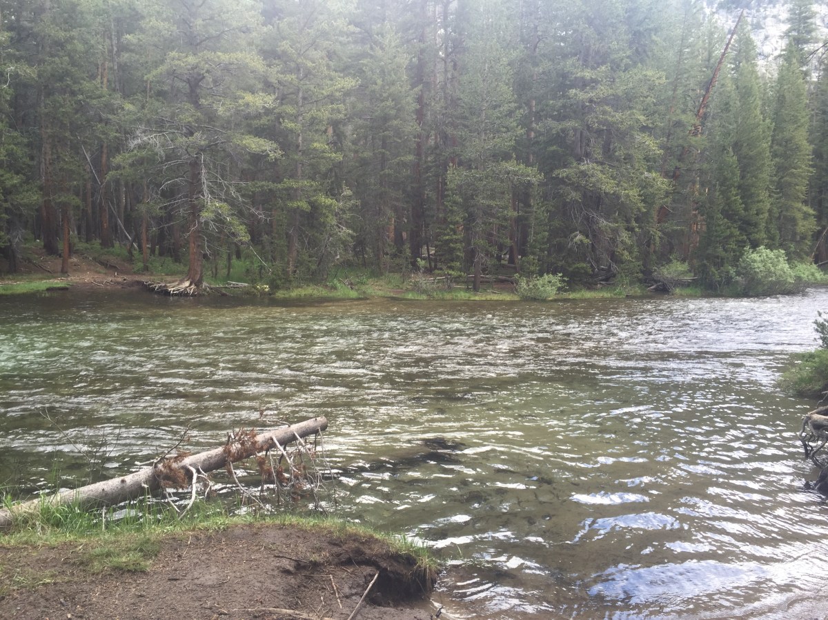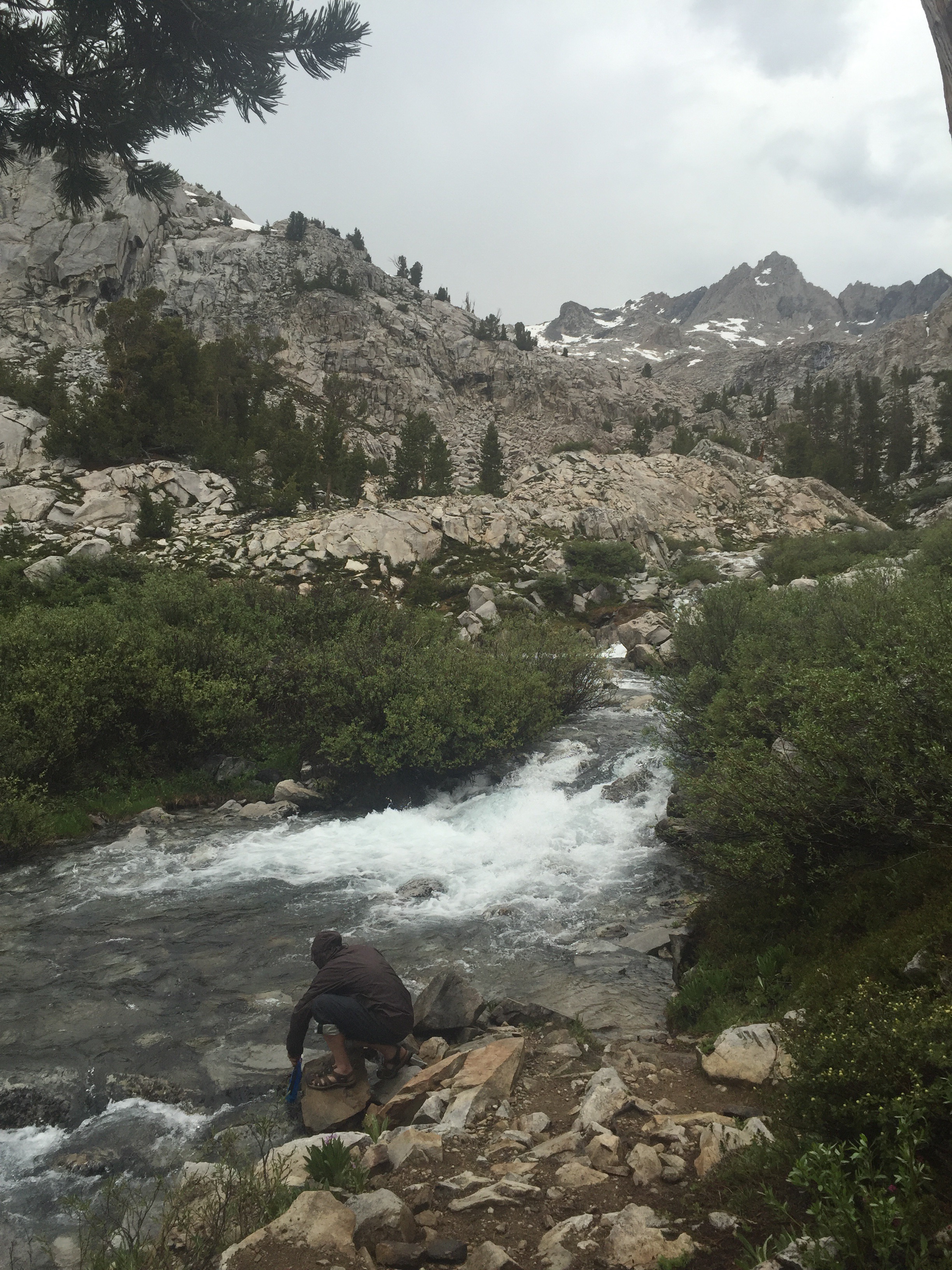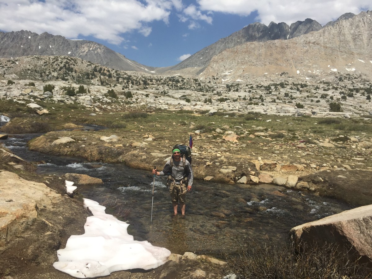 After the snow, we didn’t have any more passes to cross that day, but we did have a major ford of Evolution Creek. Evolution Creek is one of two of the most difficult water crossings on the PCT. When we got to the creek, it was about 60ft wide and at its deepest point it looked like it would be up to my rib cage. It’s hard to ford swift water when it gets above your hips. So Garrett crossed, then came back to get my bag and hook arms with me to help steady me against the flow. We made it across, and I was thankful to have him there to help me! Good thing I married him!