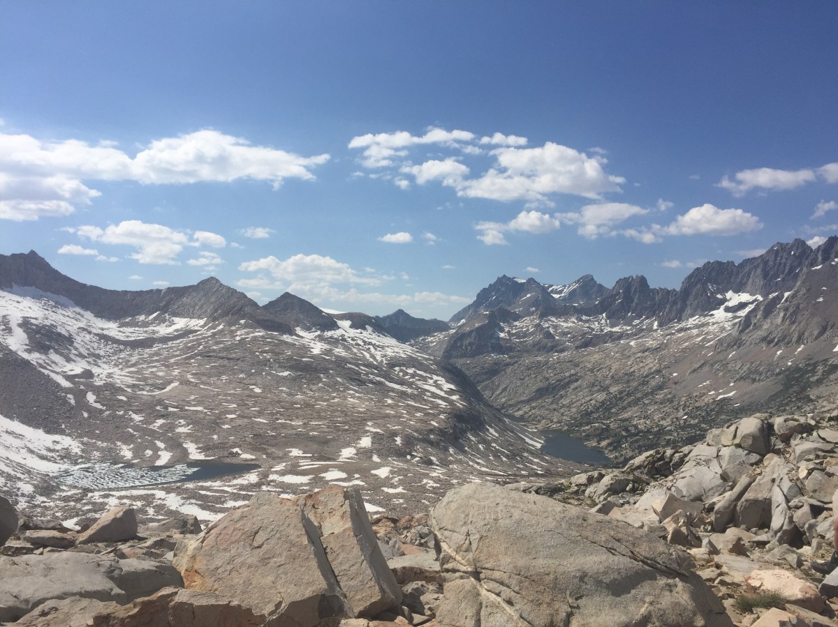 After lunch we started up Mather Pass. The snow on the way up wasn’t bad, but on the way down there was a steep boulder field with heavy snow. We slowly picked our way through the rocks and snow, and made it down to beautiful Pallisades Lake & Creek.