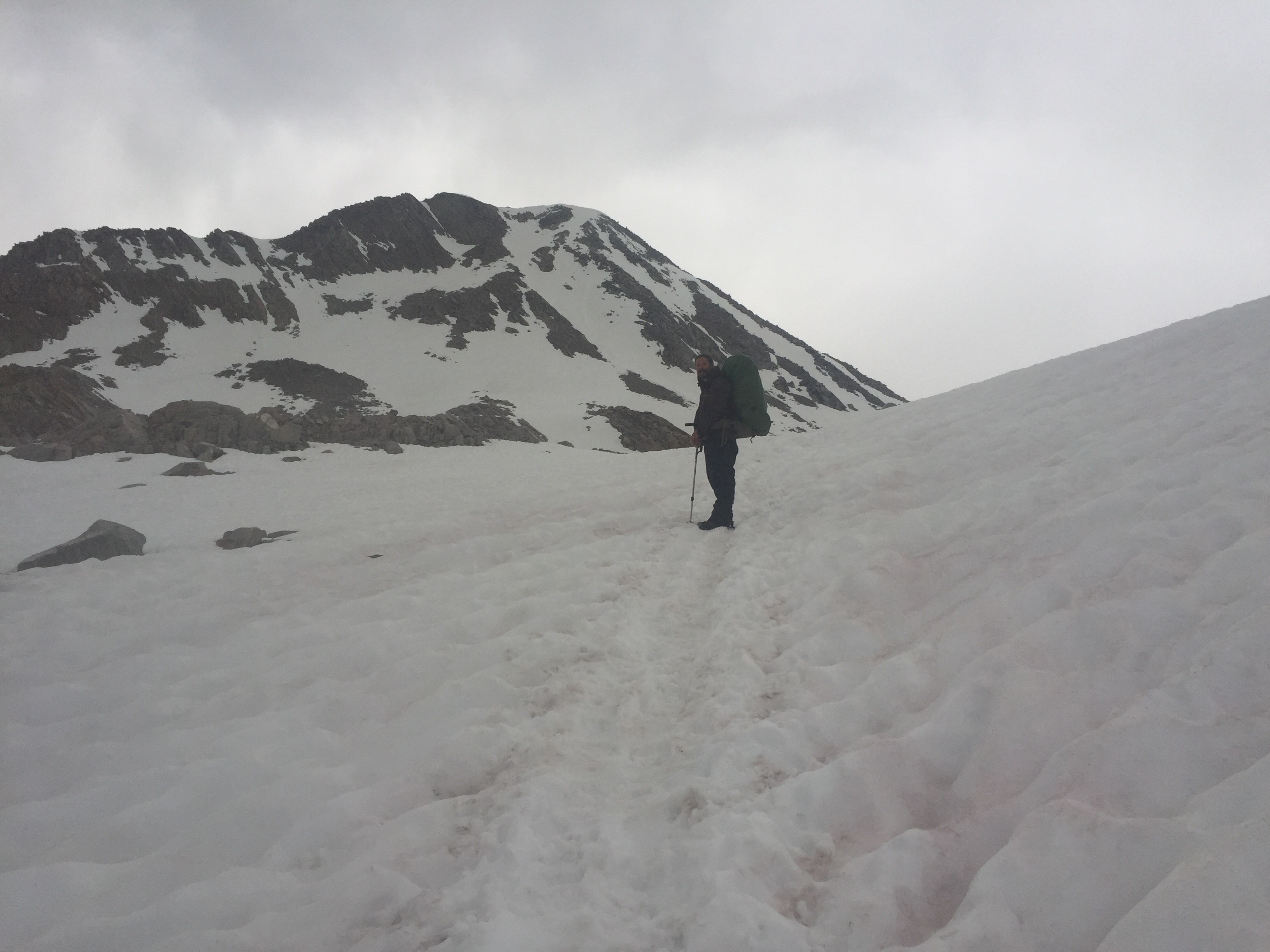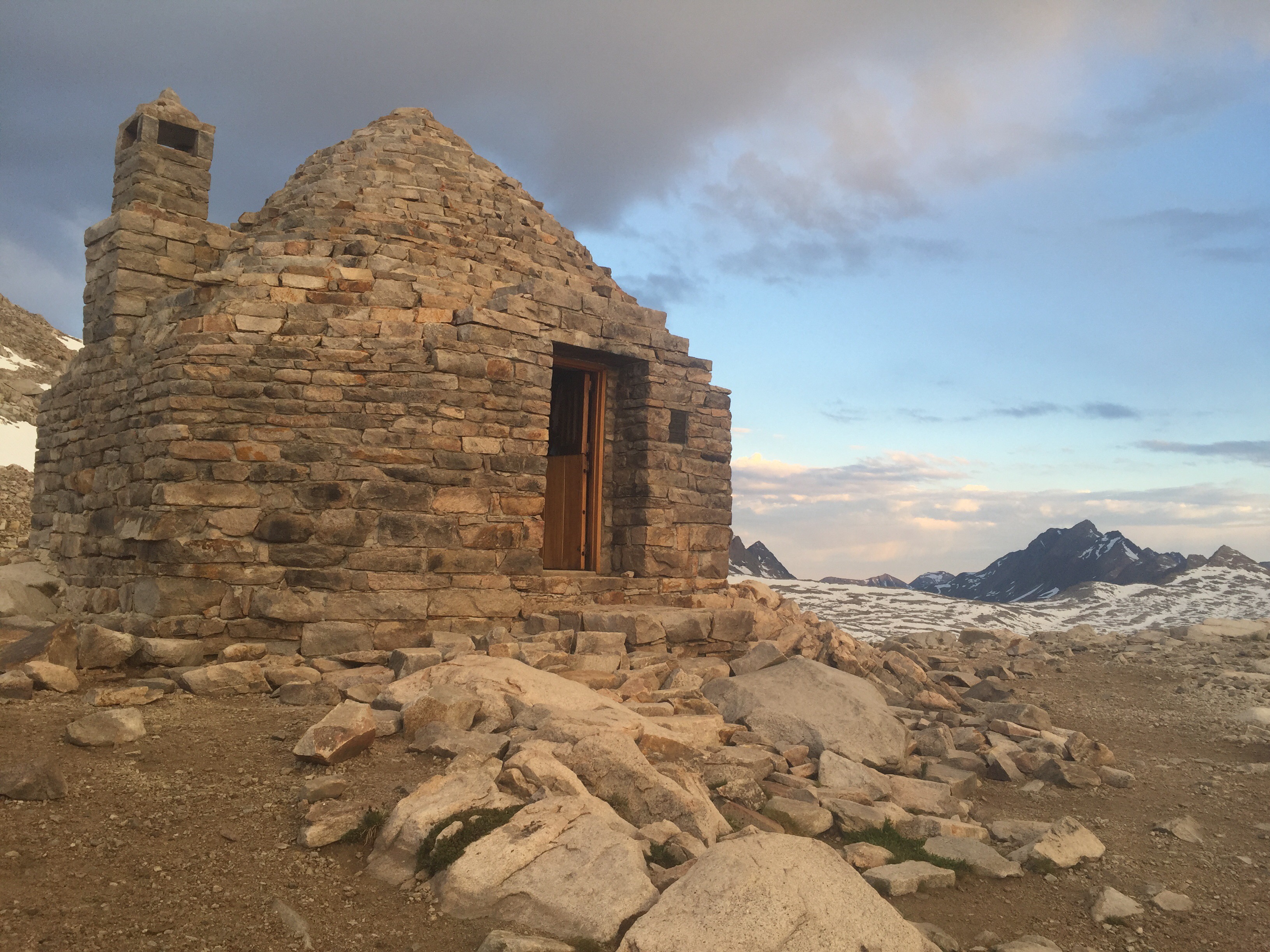 About a mile from the top of the pass we heard rumblings of thunder again, so we scurried up the final snowfield and made it to the John Muir emergency weather shelter before the rain began again.