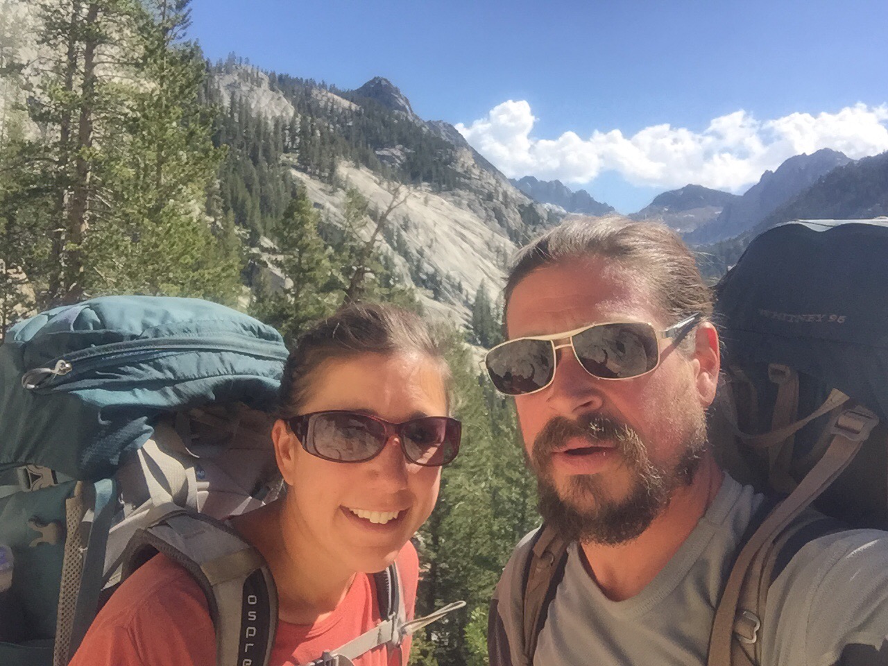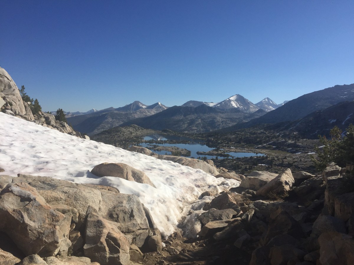 Day 55, we broke down our tent site and ate breakfast quickly, as we were eager to hit the trail to get to our next resupply location in time for dinner. We were headed to Vermillion Valley Resort (VVR), 19.4 miles away. The hike started passing a few lakes, as we ascended the final 3.25 miles to Selden Pass. We had already gained most of the elevation to the pass the night before, and it was lower than the other passes (under 11000 ft), making it less snowy and much easier than the previous ones.The views were great, and we enjoyed a gentle downhill into the valley.