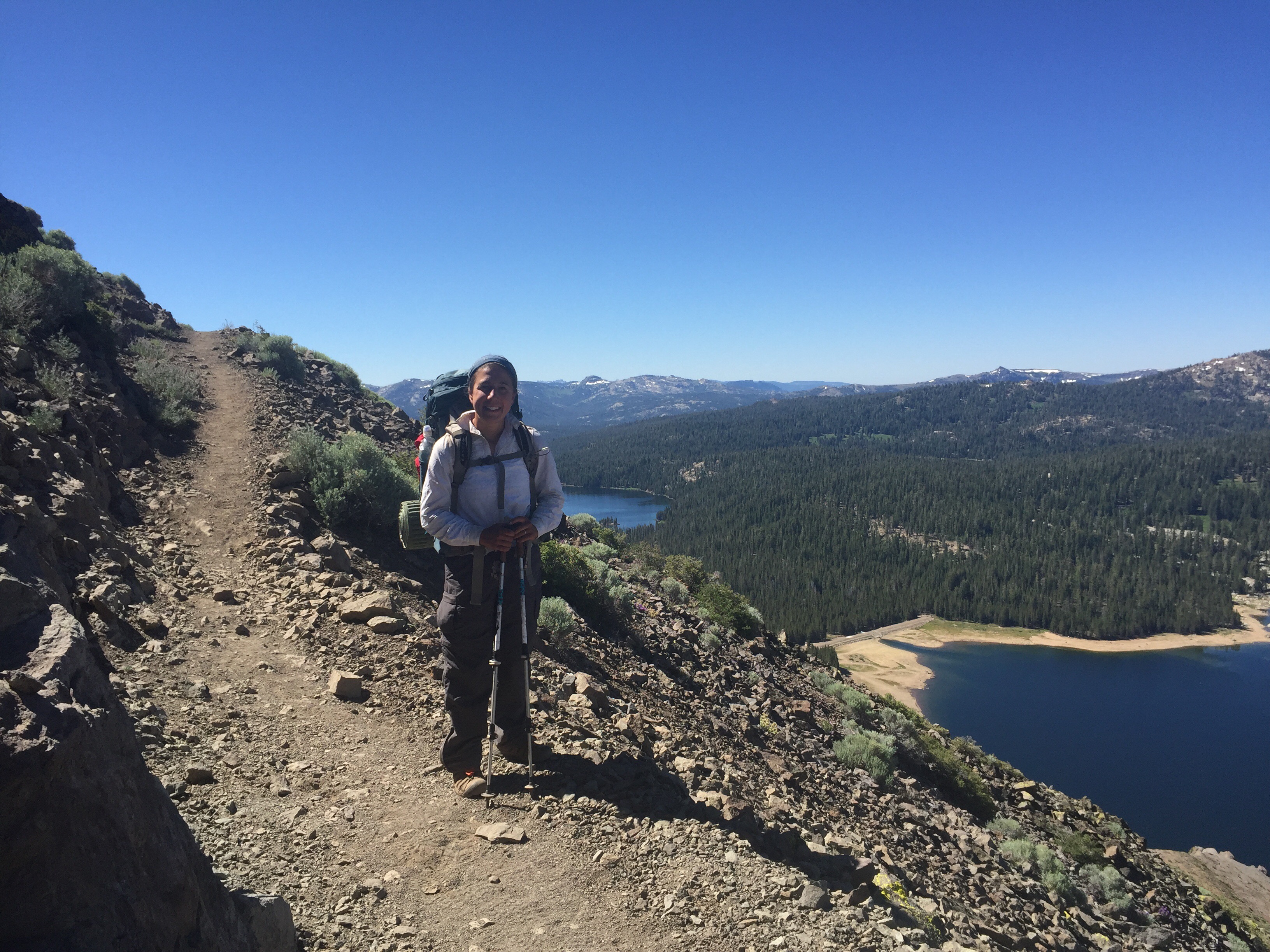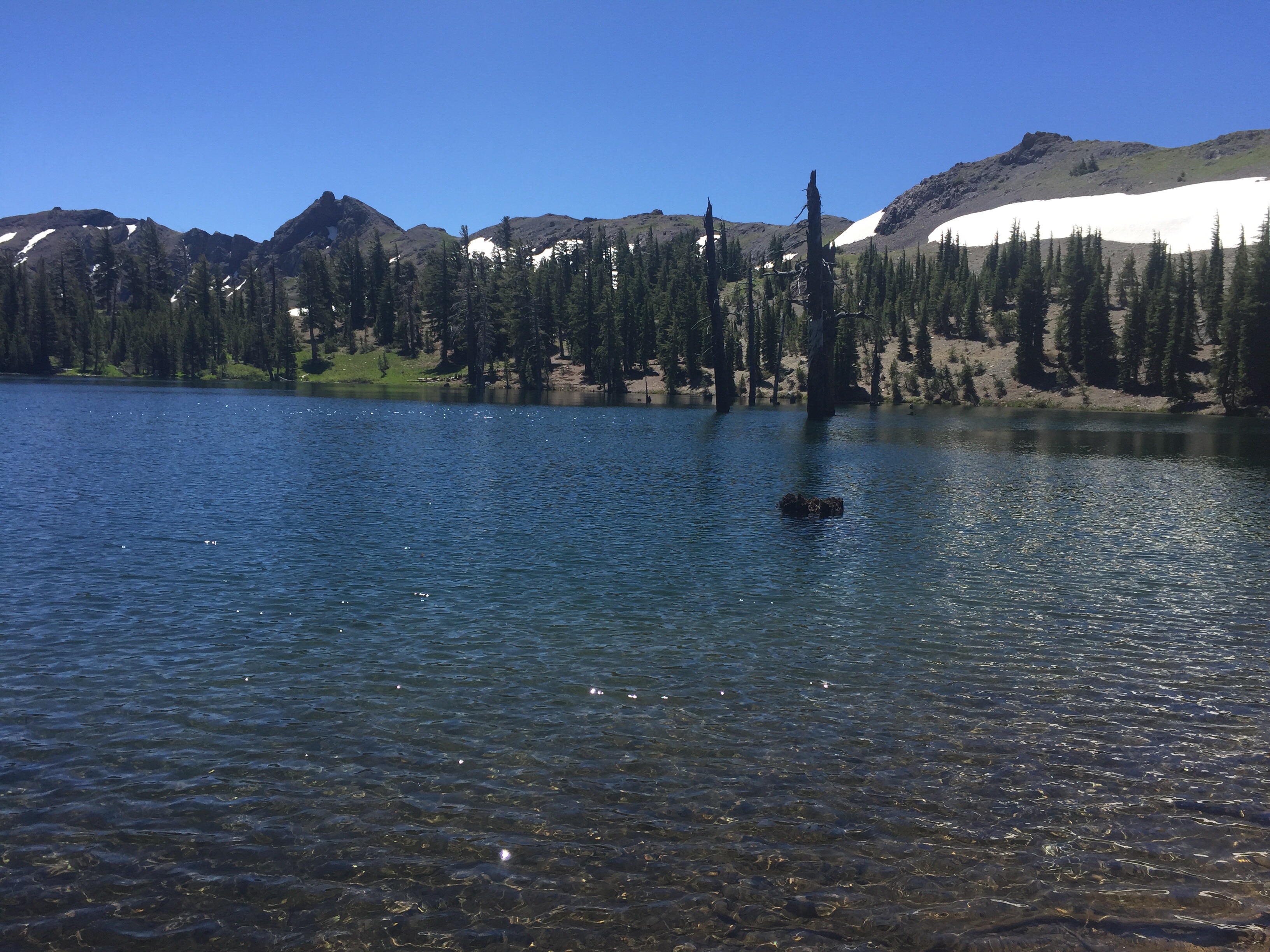 Day 69 I woke up to the buzzing of mosquitos; which was strange, as they tend to be tolerable in the mornings. This morning they were up early, and ready for blood! We quickly broke down the tent, ate our breakfast, and got on our way. We had to hike five miles or so before they relented, and when they did we had a snack. About five miles later we arrived at Echo Lake, and were eager to have a hot lunch from the lake store there! We had panini, soda, and ice cream (a welcome change from trail mix & granola bars). We grabbed some more rations, and started back at the trail. We came upon Lake Aloha a few hours later, and decided to camp on the shore. We went for a swim, then ate a delicious picnic dinner from the store; hummus, baugette, grapes, and goat cheese.