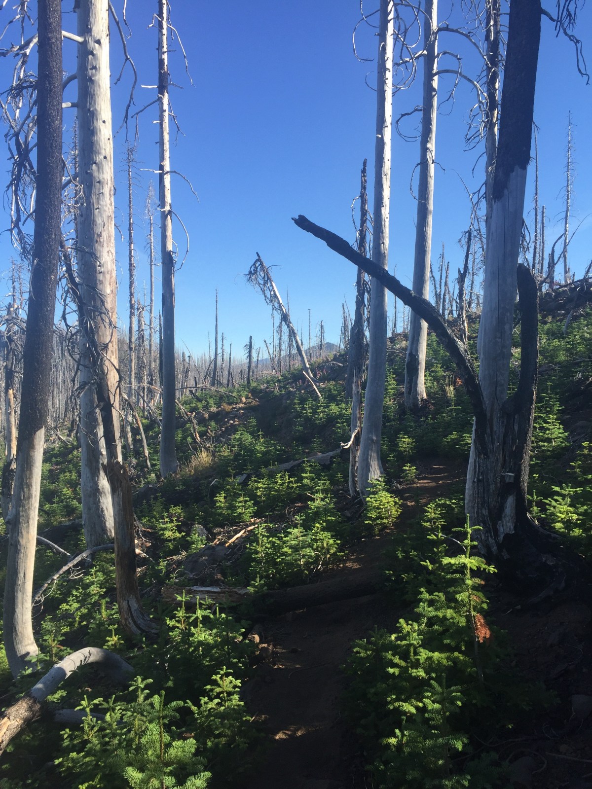 We grumbled a bit about having to carry so much water, but we had just a bit of food left as we were resupplying at Crater Lake and the terrain was beautiful and gentle- so our packs didn’t feel as heavy as we thought they would! On the way in we went through a old burn area which was strikingly beautiful with saplings as far as the eye could see.