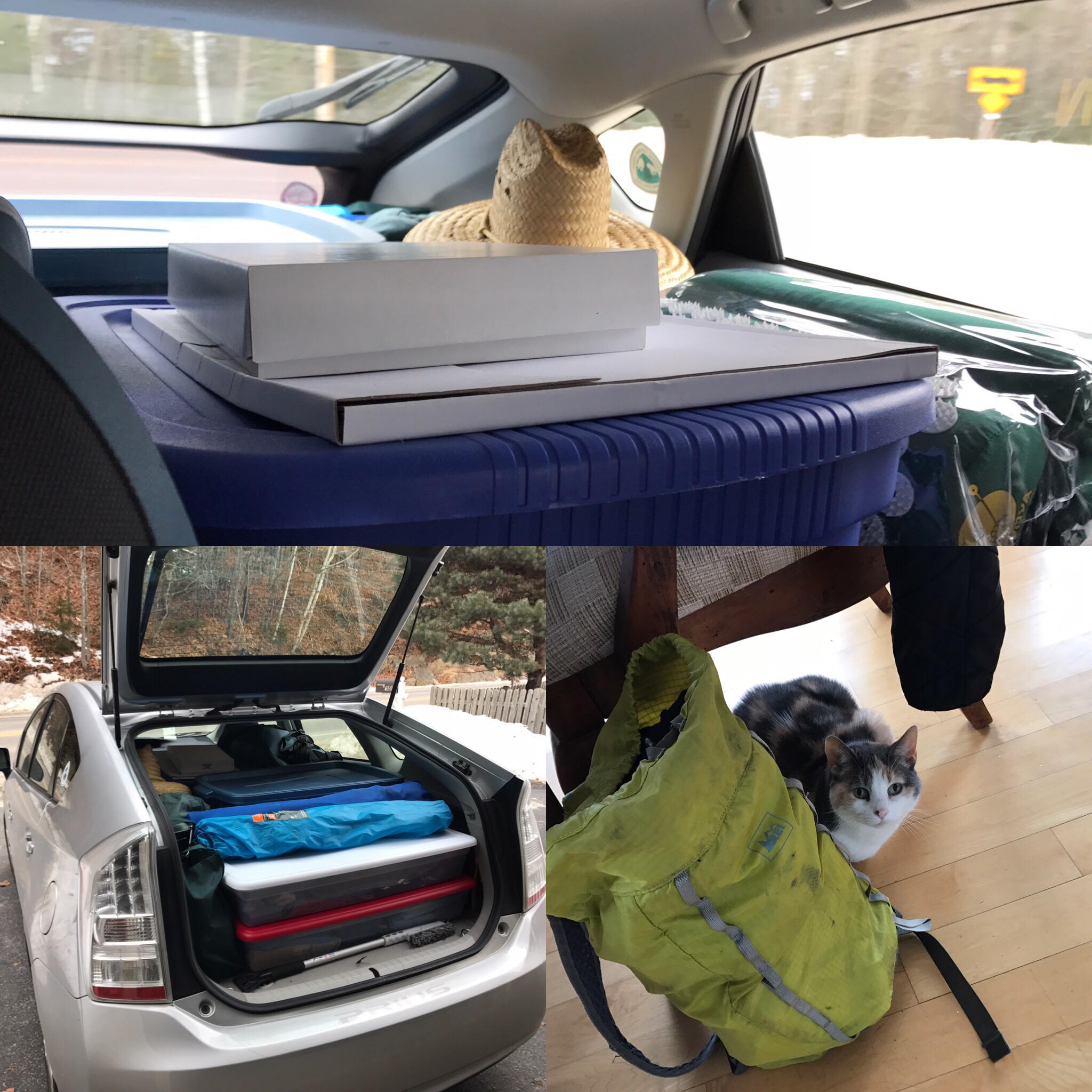 We packed-up our car for our road trip; and we treated it similar to a backpacking trip. In six weeks we’ll travel to swamps, beaches, forests, deserts, canyon lands, and cities. Temperatures will fluctuate from the 80s to below freezing, and we’ll be boating, backpacking, hiking, and sightseeing. Neither of us have lived out of our car for that long, and we’re trying life out on the road to see if we may want to purchase a vehicle more suited to the task than our 2010 Prius (although, the gas mileage is hard beat!).