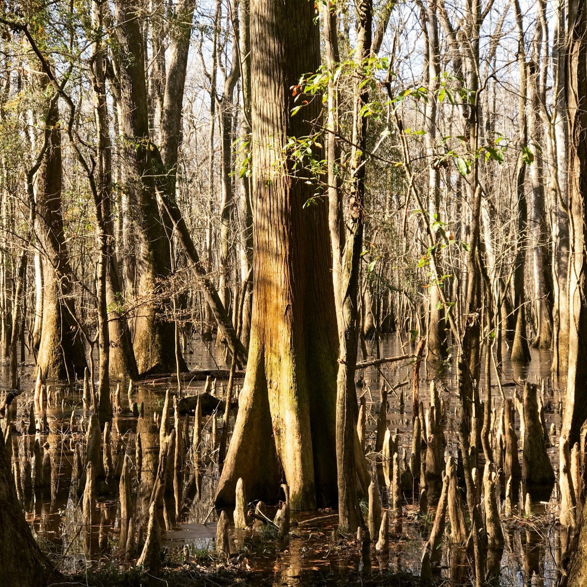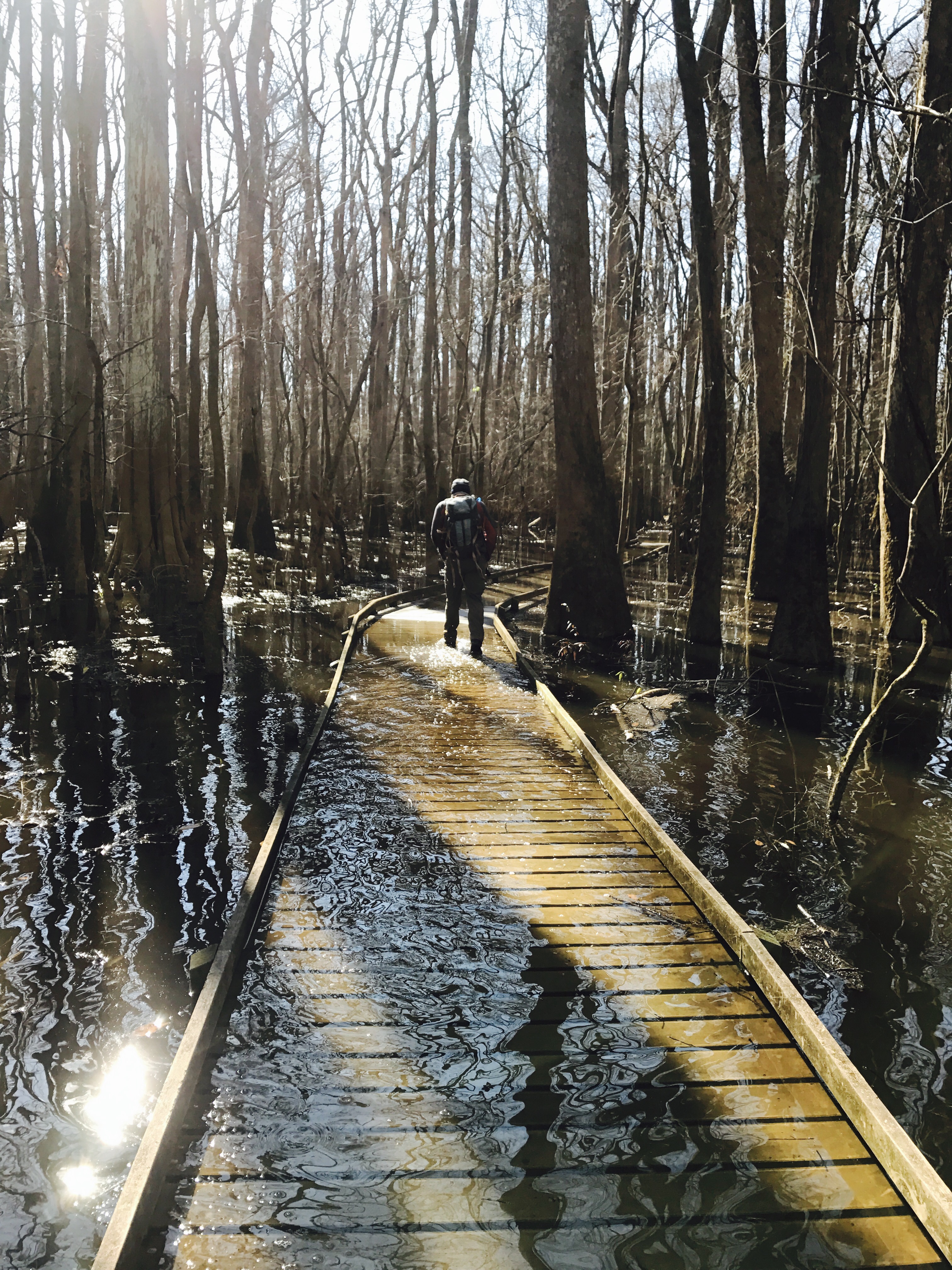 We arrived at Congaree shortly after 10am, and embarked on foot to explore the park. Congaree was made a National Park in 2003, and is the largest area of old growth bottomland hardwood forest in the United States (23,000 acres). It also has an unusually high concentration of “champion trees,” trees that have reached a record height for their species. About a two mile long boardwalk loops around from the visitor center, with various trails leading off to other areas of the park. It was unusually cold the day we were there, hovering in the high-30s most of the day; fortunately the sun was out, and we had a gorgeous start to our hike on the low boardwalk. We were quickly immersed by bald cypruss trees and their knobby roots, referred to as “knees” that protrude from the water.
