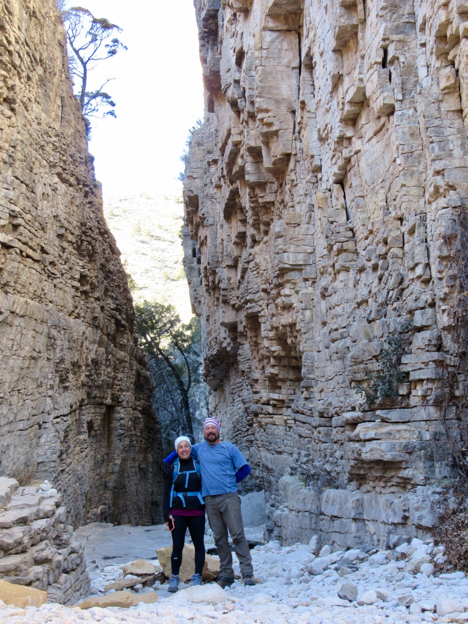 We were feeling good, so on the way down we diverted off a side trail to Devil’s Hall. We weren’t sure what to expect, but wanted to do a few more miles and the guide said it was a beautiful hike. Guadalupe Mountains are part of a fossilized coral reef, and the area of Devil’s Hall showcases this history. We saw layers of sedimentary rock, and were in awe standing in the natural amphitheater it formed. Shortly after, we entered the hall.