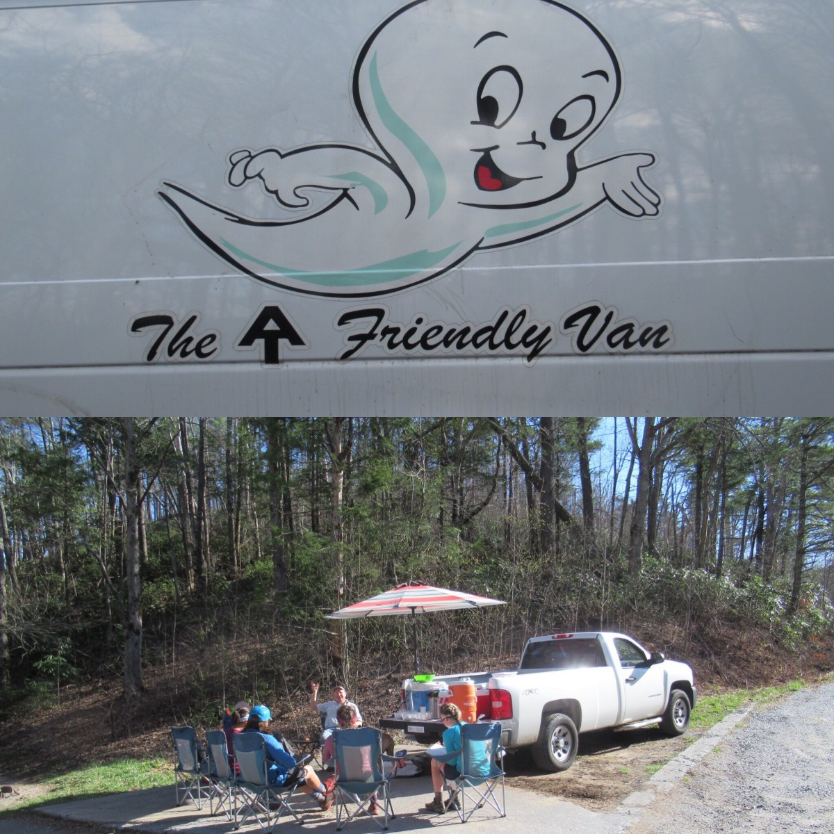 The next day we were motivated to make it nearly 22 miles to Clyde Smith Shelter, to ensure the following day we’d only have ten miles to make it to Carvers Gap where we had planned to meet a sister of a friend who’d offered to host us for the night. The trail had dried-up by now from all the rain and snow earlier in the week, and we sailed smoothly all day. We were also surprised by not one, but two separate trail magic stops, one in the morning and one in the afternoon. In the morning a minister was set-up with sweet drinks, coffee, and homemade baked goods; and in the afternoon we ran into a former hostel owner and his AT Friendly Van with soda and Little Debbie snack cakes. We realized on the trail we do the exact opposite of what we were taught as kids; we willingly take candy from strangers out of vans. I’m surprised how many trail angels there are along the AT compared to the PCT. Garrett thinks he’s come across more trail magic on the trail this year than when he did it in 2011. We’re very thankful for all the support that they provide!