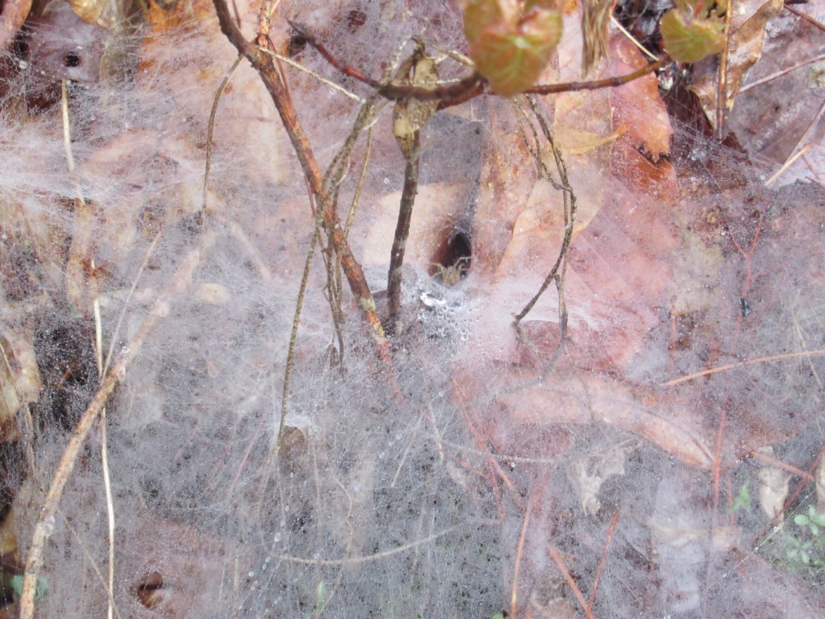 Fortunately the next morning the sun was out again, and it highlighted all the spider webs in the trees. Garrett took this good picture of a spider waiting for breakfast at the bottom of a funnel web.