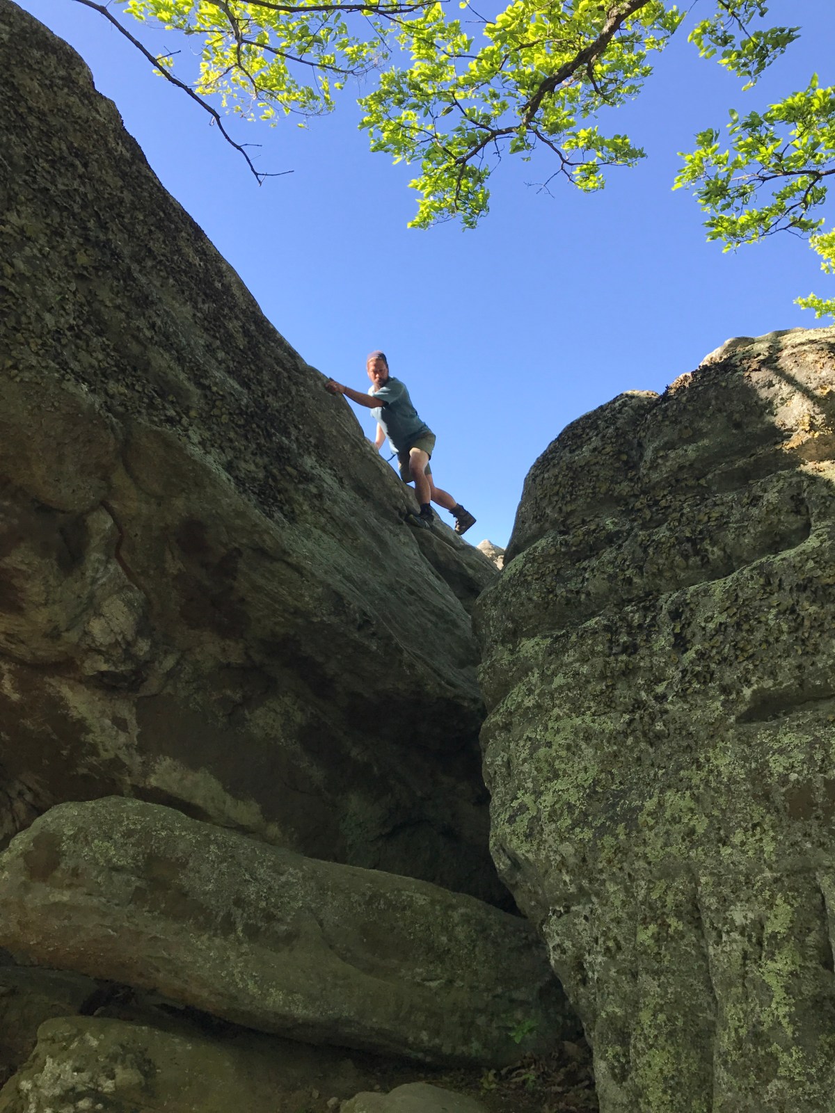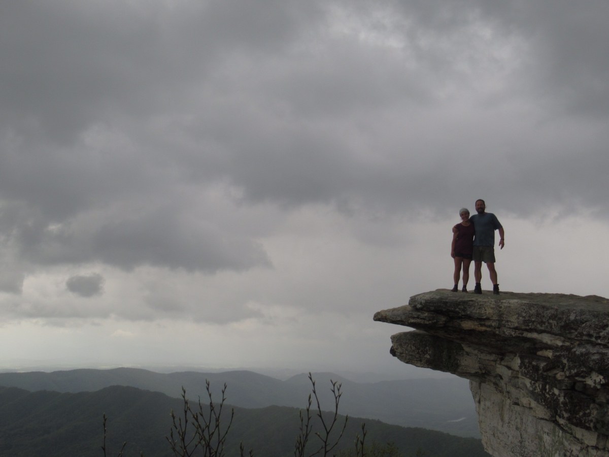 We crossed a road and stumbled upon trail magic, coffee and doughnuts! I’ve been saying I thought coffee and doughnuts would be great trail magic, and I was not disappointed! It was a powerful snack, and the rest of the afternoon was a breeze. We climbed up to McAfee Knob, and snapped the picture below just before the rain started again.