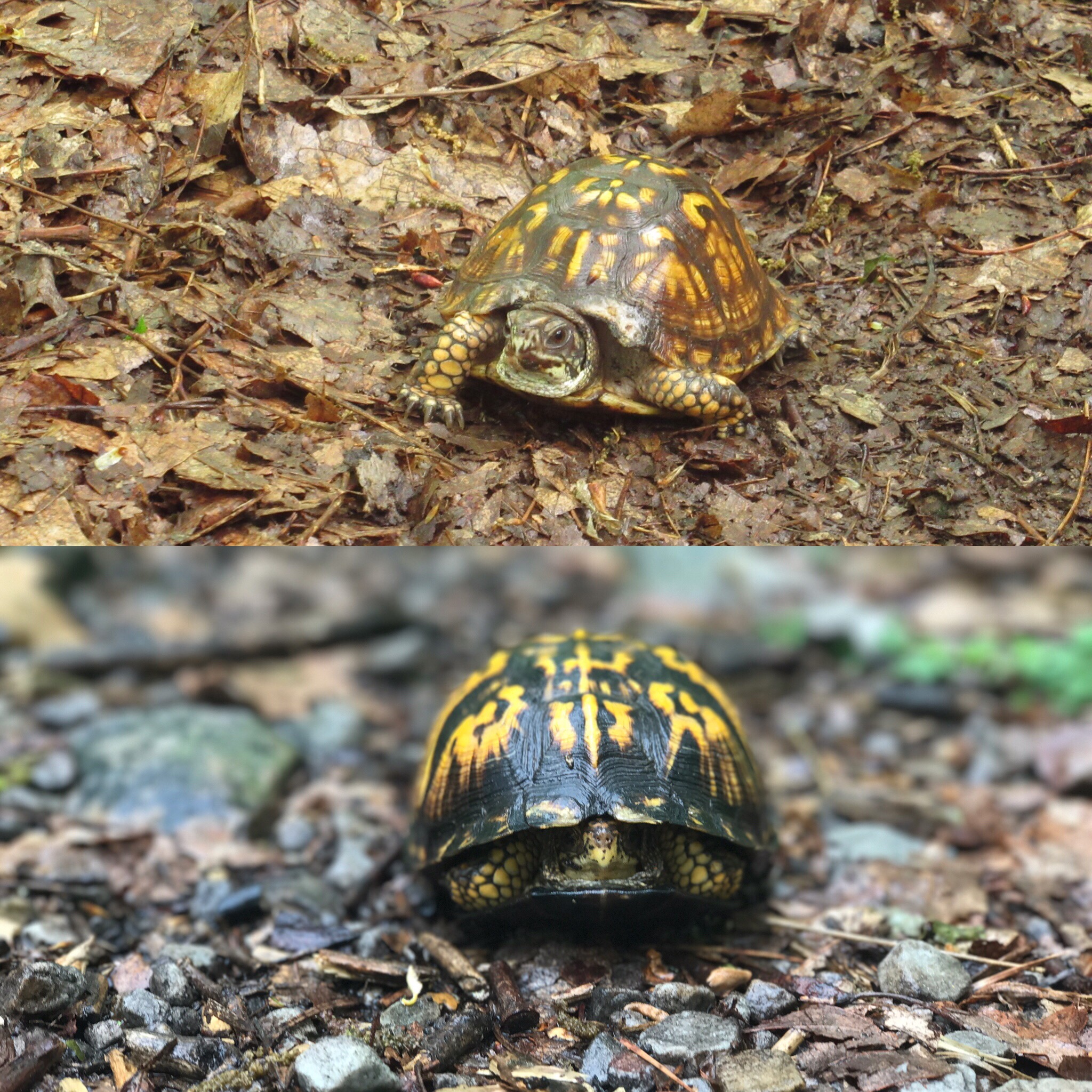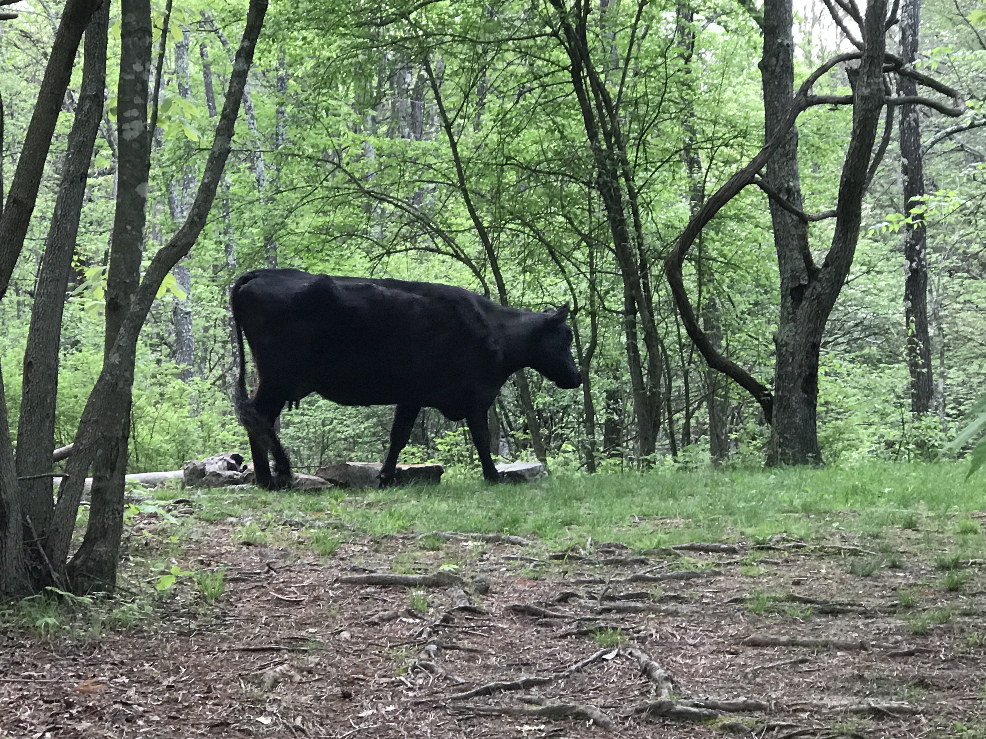 The next morning while packing up I thought I saw the biggest black bear I’d ever seen, until I realized it was just a cow. Virginia is full of farm land, and based on the farm sounds echoing from the valley below there was one close by. Not sure how this cow made it up to the shelter, but it ate some leaves and meandered down the trail. We followed it for a couple minutes before it veered off the trail, and made its way elsewhere. Our wildlife viewings for the day were not over. It rained off and on throughout the day, and it seemed to coax the turtles out of their hidding, because we saw two on the trail as well as a bunch of salamanders.