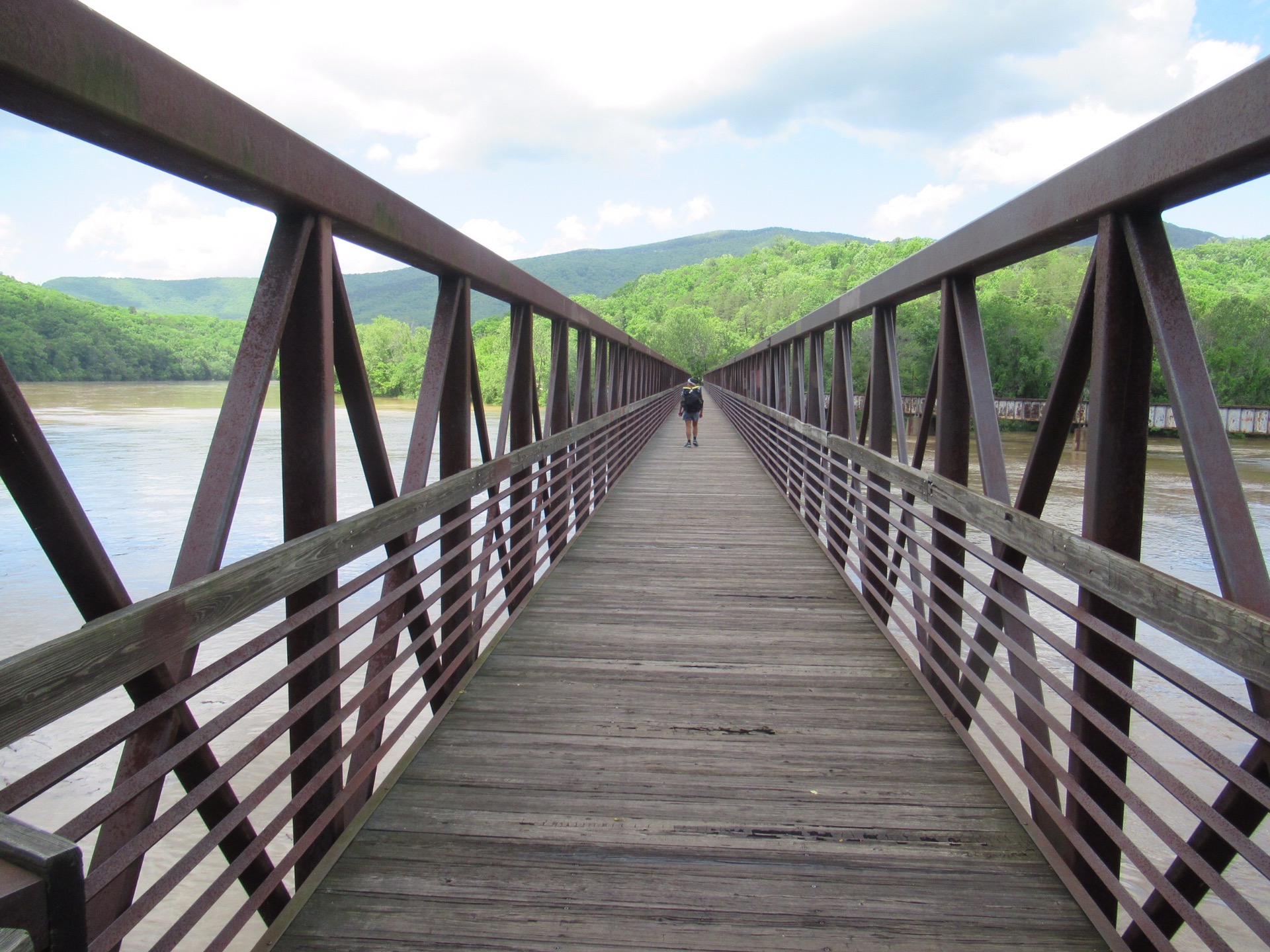 It rained until about 8am the next morning, so we stayed in the tent a little longer to stay dry. We started hiking thinking it would clear, but a cold rain started to fall an hour later. We hiked fast to stay warm, and the rain stopped for a good a little before noon. We made it to Matt’s Creek, which normally is a rock hop or a shallow ford, but the inch of rain that fell overnight made it a raging torrent. We met Geordi there who was trying to figure out a safe way to cross. We’ve crossed rapidly moving or deep water in the Sierras with out any incident, but this water at least knee high on Garrett and moving faster than we’d ever experienced. He felt it would sweep him off his feet. We looked for alternative places to cross without any luck. We were getting ready to camp out and wait until the next day when the water level should have dropped, but Geordi found a downed tree just long enough to span the narrowest part of the creek. Garrett and him moved it into place, and found another tree to stabilize the crossing; enabling us to make it to the other side. We were happy to keep hiking! We made it to the James River, where fortunately there was a 1,000 foot long bridge to help with the crossing.