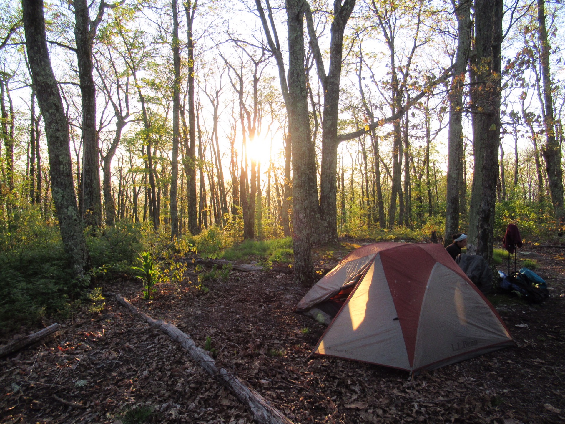 The next day we covered the first seven miles in good time, but then we started a long climb up to the top of Apple Orchard Mountain. We slowed a bit, and decided to stop at 18 miles where there was a shelter. The weather report said there would be heavy rain starting around 7pm in the evening, with showers starting late afternoon. When we arrived at the shelter though it was full at 3:30pm. We decided if we were going to have to set up our tent we might as well hike some more. With the sky darkening we eeked out three more miles through a forest full of pink trillium and set up camp. We almost had dinner made before it started to downpour. We made do, and hopped into the tent to stay dry.