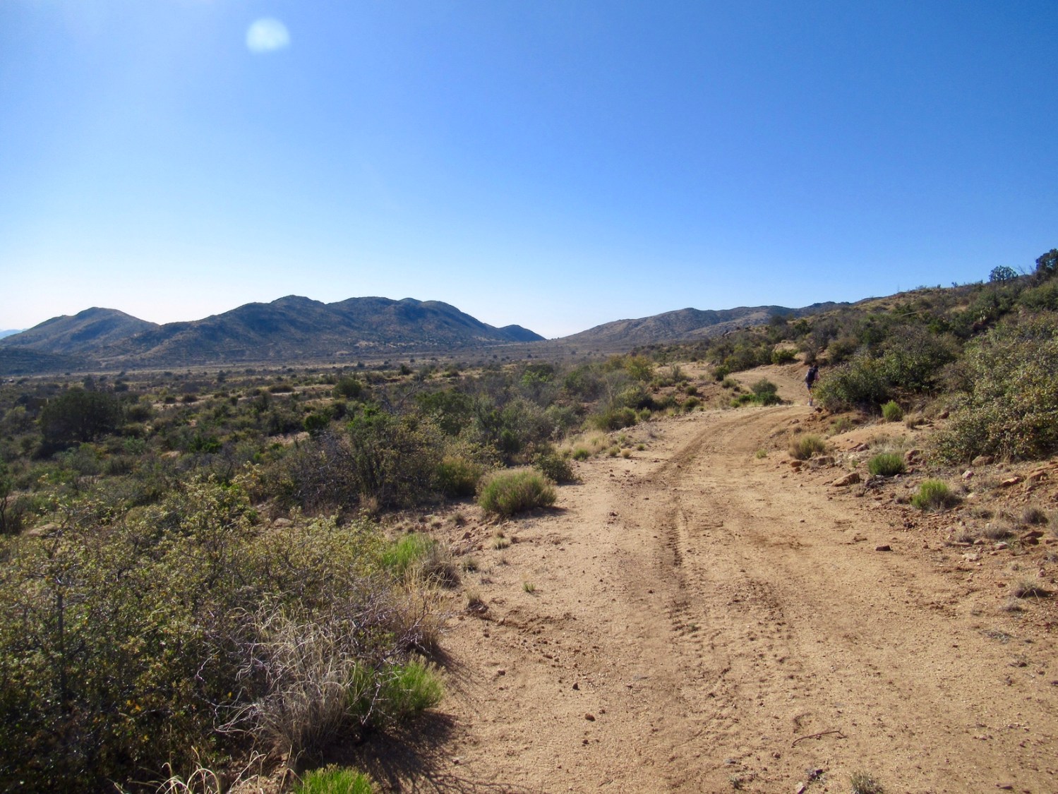 We walked three miles on paved roads out of town, skipping the unmarked trailhead (which is really just a barbed wire fence to crawl under), causing us to crawl under the fence further north, and navigating towards the trail. When we found it by way of GPS on my phone, it looked no different than what we had been walking on. We had about ten miles of cross country travel, walking across the desert towards the mountains in the distance. Sometimes a well traveled trail appeared under our feet, but more often than not we felt like we were the first ones to be walking our steps across the dry earth. We continued to scoot under barb wire throughout the morning. Once there was a gate, but a bull was guarding the passage, so we choose to scoot again. We stopped for a couple of breaks to get out of the sun, and eventually made it to a dirt road for the remainder of the day.