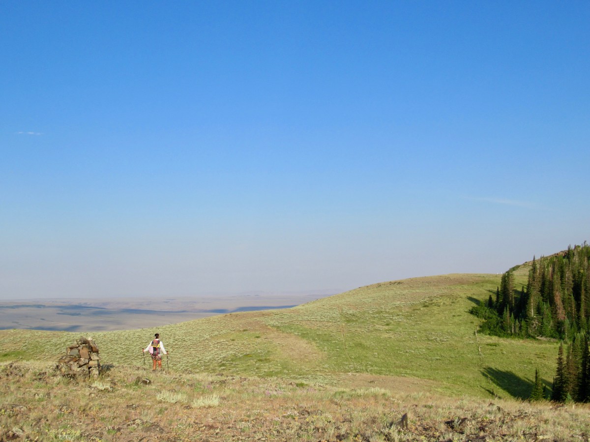 Our first night on the trail in Wyoming was a relief. We both slept well, as we always tend to do out here, and were up and out on the trail before the mosquitoes could find us on the edge of the forest. We’d heard voices and saw a tent nearby, and soon enough at our first water source we ran into the folks behind the tent, 2 Bad Dogs. They were on the trail a couple years back, and came back this year to finish the sections they had to miss. They only had three more miles on this section before they made it to their car. It was a pretty section to leave from. The landscape slowly rolled out of the mountains, and we could see the Great Basin shimmering from the heat in the distance.
